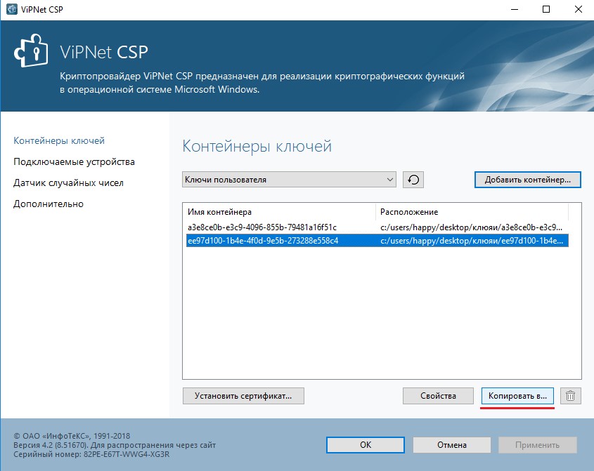 Перейдите на вкладку Контейнеры, выделите нужный контейнер одним нажатием левой кнопки мыши, и нажмите кнопку Копировать в… (Рис. 1).