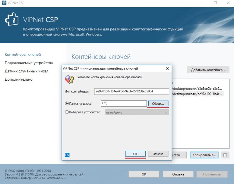 Выберите путь сохранения копии контейнера ключа и его новое имя (при необходимости). Для этого нажмите кнопку Обзор (Рис. 2). Для копирования на токен выберите пункт «Выберите устройство…». Предварительно должны быть установлены драйвера токена. Также нужно убедиться, что токен поддерживает копирование на него.