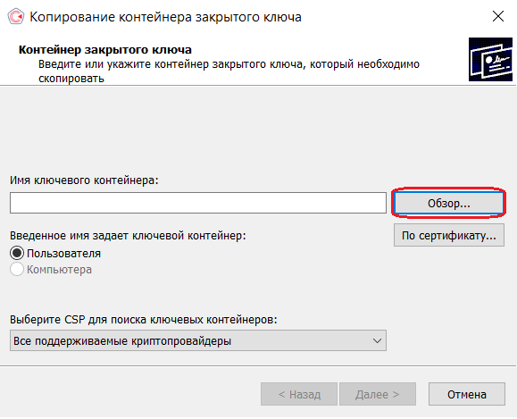 3. В окне «Копирование контейнера закрытого ключа» нажмите на кнопку «Обзор».