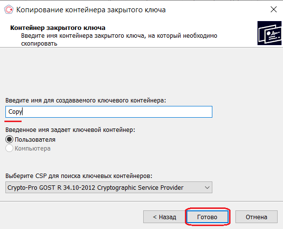 6. В следующем окне Введите имя создаваемой копии КЭП. Затем кликните «Готово».