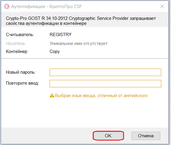 8.1. На новый контейнер будет предложено установить пароль. Рекомендуем установить такой пароль, чтобы Вам было легко его запомнить, но посторонние не могли его угадать или подобрать. Если вы не хотите устанавливать пароль, можно оставить поле пустым и нажать «ОК».