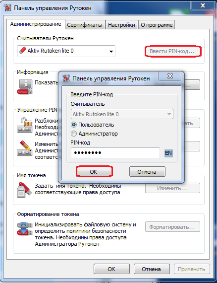 Стандартные PIN-коды на Рутокен: Пользователь: 12345678 Администратор: 87654321 • Смена PIN-кода пользователя/администратора. Откройте «Панель управления Рутокен», нажмите «Ввести PIN-код…», введите пароль пользователя/администратора и нажмите «ОК».