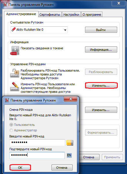 После входа на Рутокен станет доступна кнопка «Изменить…», нажмите её, введите новый PIN-код два раза и нажмите «ОК»