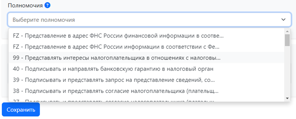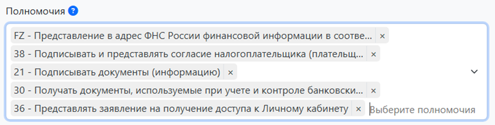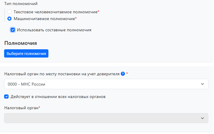 | Для указания полномочий ФНС необходимо использовать только машиночитаемые полномочия. |