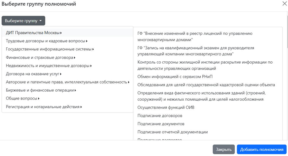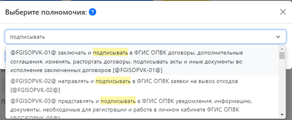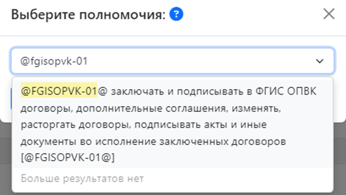 Чтобы выбрать полномочие воспользуйтесь кнопкой «Выберите полномочия»