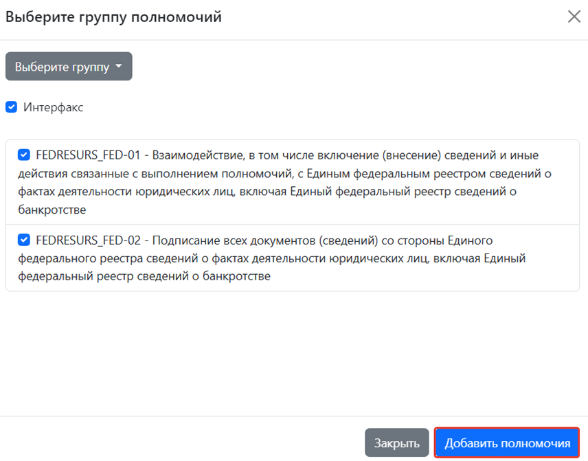 После выбора необходимых полномочий нажмите кнопку «Добавить полномочия»
