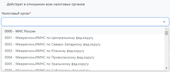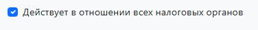 По умолчанию чекбокс установлен на «Действует в отношении всех налоговых органов»