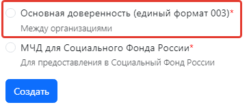 В открывшемся диалоговом окне необходимо выбрать тип доверенности «Основная доверенность (единый формат 003)», после чего подтвердить действие, нажав кнопку «Создать».