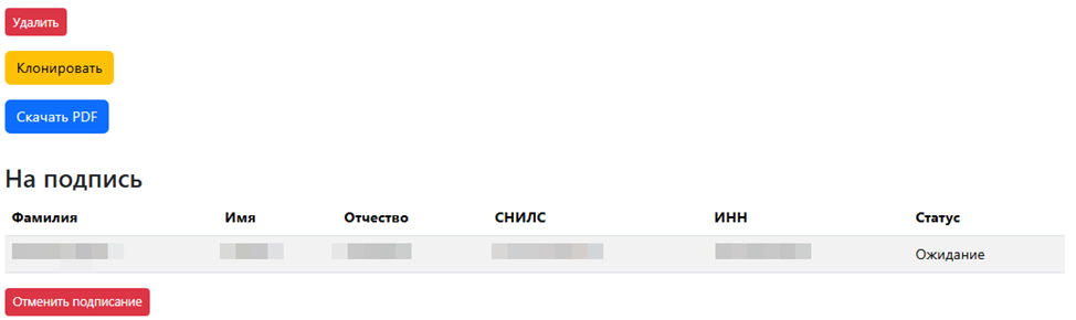 После нажатия на «Отправить на подписание» документ перейден на следующий шаг «Ожидание подписания».