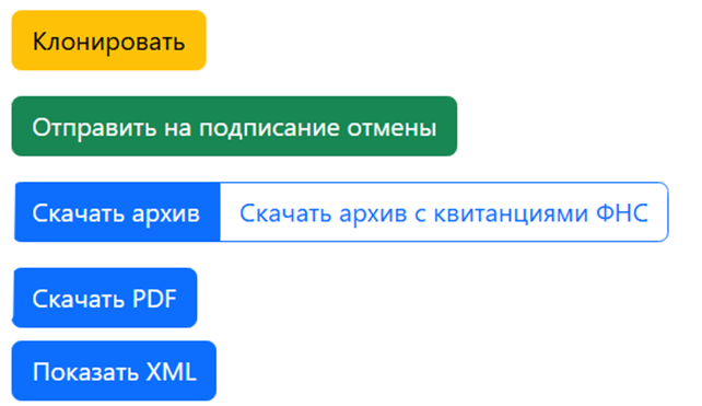 - Клонировать — создаёт полную копию доверенности, но со старыми датой начала и окончания.