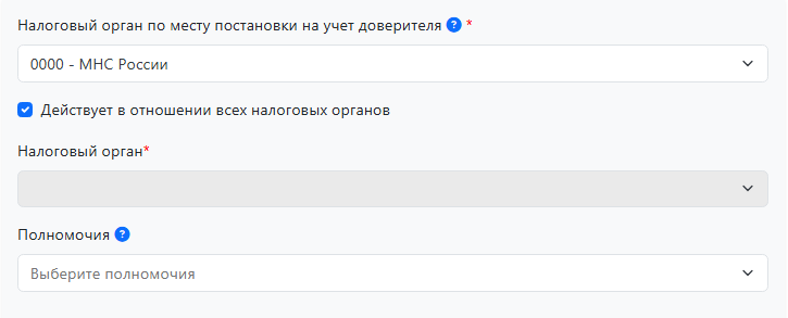 Далее потребуется выбрать в отношении каких налоговых органов действует доверенность.