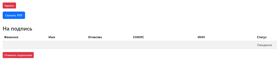 После нажатия на «Отправить на подписание» документ перейден на следующий шаг «Ожидание подписания».