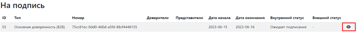 | В случае если кнопка «Подписать» отсутствует, значит пользователь не обладает типом членства «Доверитель», либо он в выписке организации не является лицом, имеющим права действовать без доверенности. |