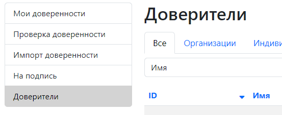 В списке выбора доверителя отображаются все организации или ИП у которых пользователь имеет тип членства как Доверитель, Администратор.
