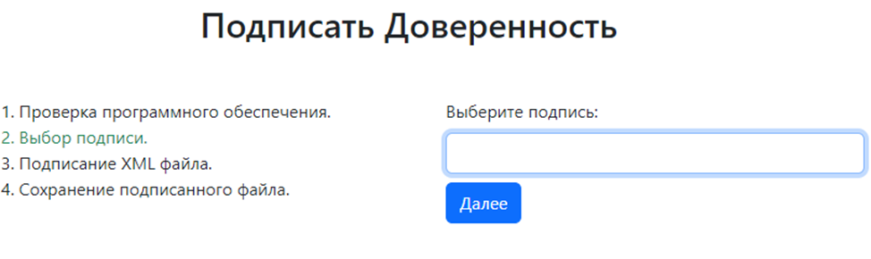 Выберите подпись согласно выбранному доверителю из документа и нажмите «Далее».