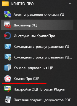 2) Нажмите кнопку «ПУСК» -> «Программы«, раскройте папку Крипто-Про и выберите пункт Крипто-Про CSP