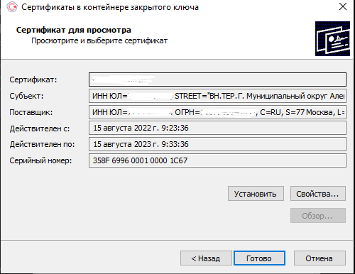 9) Просмотрите все данные сертификата, убедитесь, что это нужный Вам сертификат и нажмите кнопку «Установить»