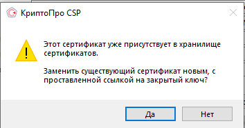 Если сертификат уже был установлен ранее, то будет получено сообщение