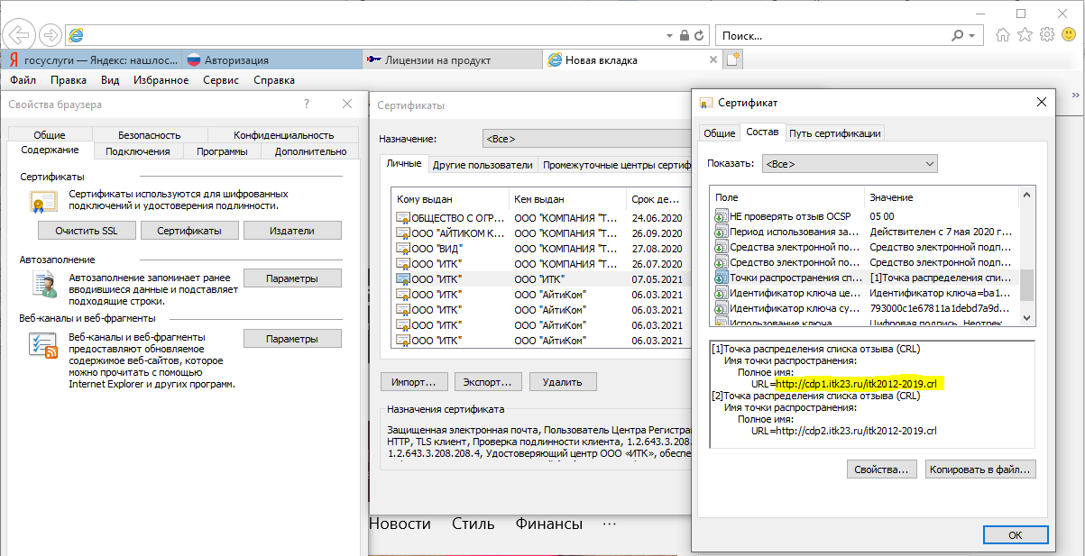 1. Открыть программу «Internet Explorer»/«Сервис»/«Свойства»/«Содержание»/«Сертификаты», или же через меню кнопки «Пуск» – «все программы» – «Крипто про» — «сертификаты».