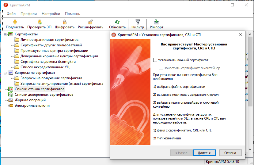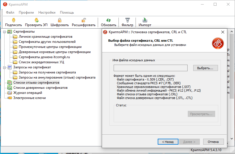 4. Следовать инструкции «Мастера импорта сертификатов».