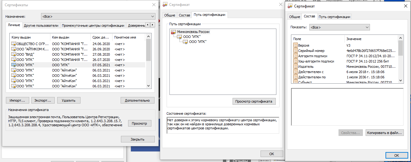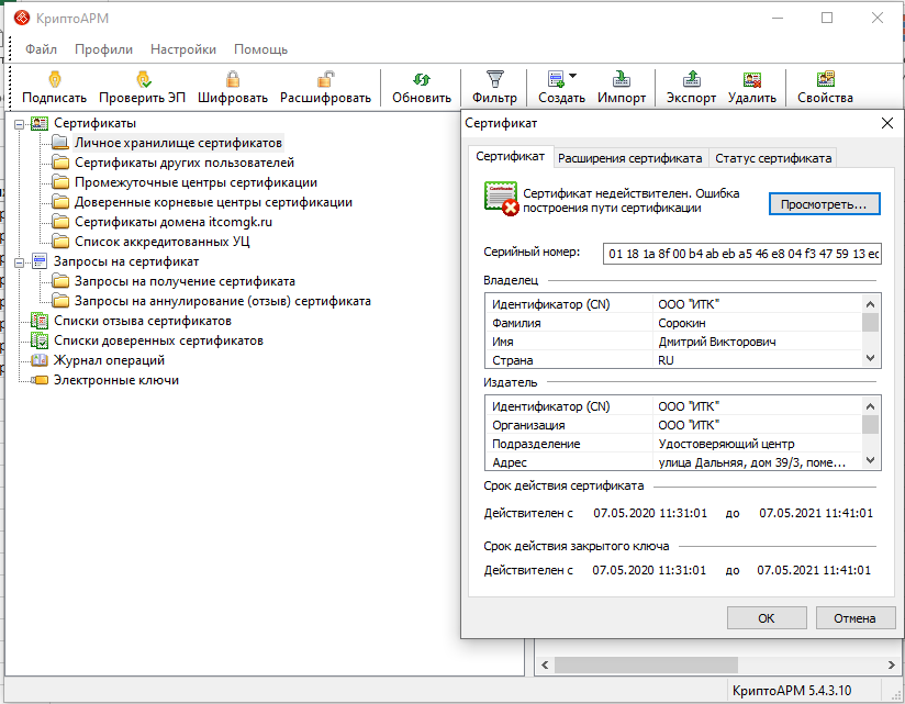 КриптоАРМ: статус сертификата: недействителен, ошибка построения пути сертификации: