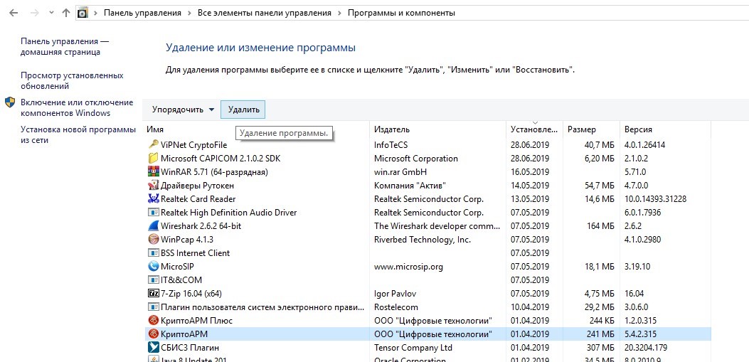 1. Удалите программу «КриптоАРМ» через Панель управления;
