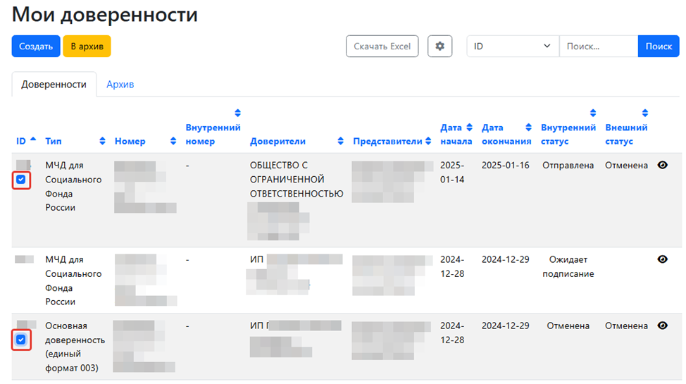 Для массового перемещения доверенностей используйте чекбокс. Они находятся в столбце с Id (идентификатором) доверенности. Отметьте галочкой все доверенности, которые вы хотите переместить.