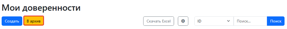 Когда вы активируете чекбокс напротив выбранных доверенностей, справа от кнопки «Создать» появится новая кнопка «В архив», которая позволит переместить отмеченные МЧД в архив.