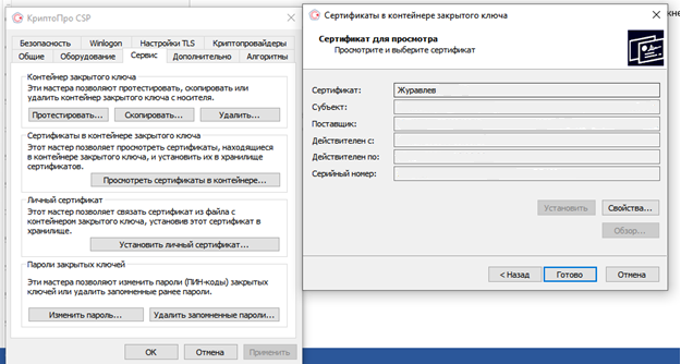 - Перейти в меню «Пуск» — найти папку «Крипто про» — открыть «Крипто про CSP» — Перейти на вкладку «Сервис» — нажать «просмотреть сертификаты в контейнере» — нажать «обзор»