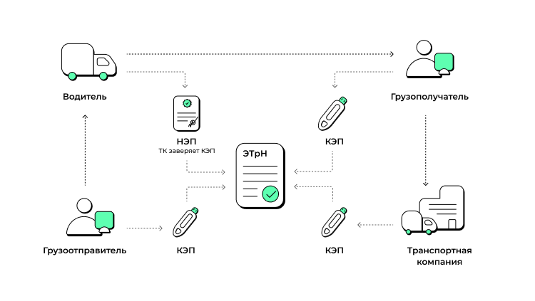 - Система отправляет подписанную накладную грузоотправителю и перевозчику, которые ставят свои КЭП.