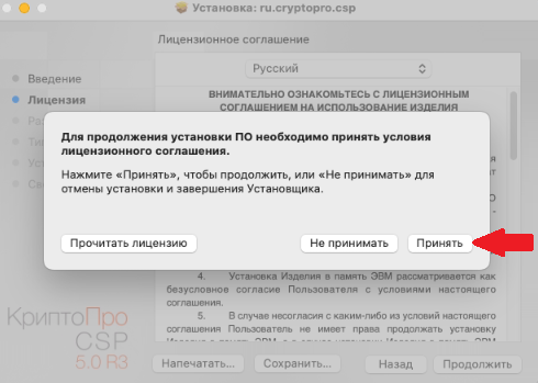 6. Чтобы продолжить установку, потребуется принять условия Лицензионного соглашения. Для этого в появившемся окне нажмите Принять.