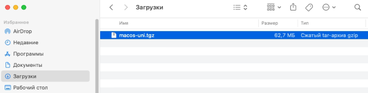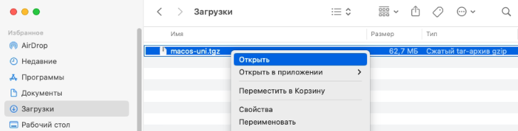 3. Правой кнопкой мыши нажмите на файле macos-uni.tgz и выберите «Открыть«.