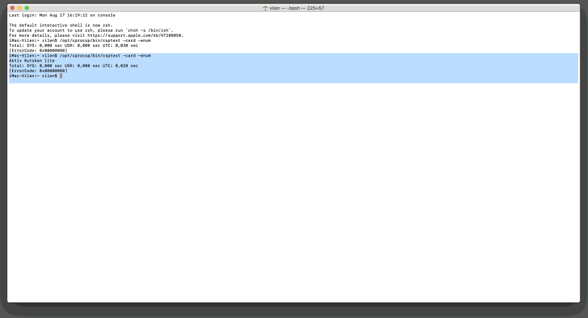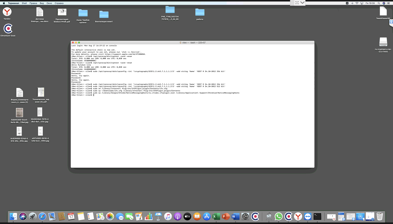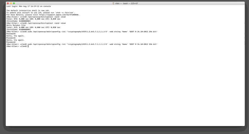 2. Далее подключаем к компьютеру usb-токен, запускаем Terminal (см. пункт «Запуск приложения macOS Терминал (Terminal)») и выполняем команду: