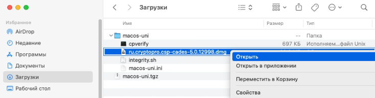 5. Раскройте новую папку, правой кнопкой мыши нажмите на файле «ru.cryptopro.csp-cades-5.0.12998.dmg» и выберите «Открыть«.