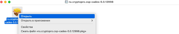 6. У вас откроется новое окно. В этом окне нажите правой кнопкой мыши на файле «ru.cryptopro.csp-cades-5.0.12998.pkg» и выберите «Открыть«.