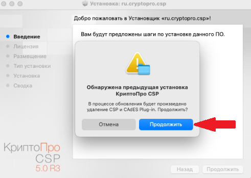 9. В случае если у вас ранее была установлена другая версия программы КриптоПро CSP, будет выдано предупреждающее сообщение. Нажмите Продолжить.