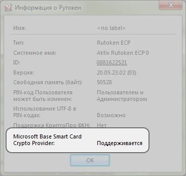 3. Откроется окно с информацией о носителе. Проверьте статус напротив графы Microsoft Base Smart Card Crypto Provider.