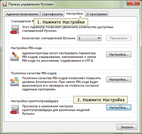 4. Нажмите Настройки, в поле Настройки криптопровайдера нажмите кнопку Настройка