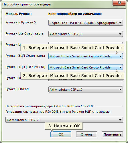 5. В графе Рутокен ЭЦП Смарт-карта и графе Рутокен ЭЦП (2.0) выберите Microsoft Base Smart Card Crypto Provider, нажмите ОК