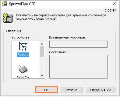 В окне «Вставьте чистый ключевой носитель» выберите носитель, на который будет помещен новый контейнер.