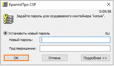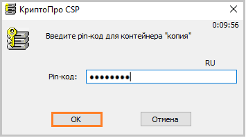 Если вы копируете контейнер на смарт-карту ruToken, сообщение будет звучать иначе. В окне ввода укажите pin-код. Если вы не меняли pin-код на носителе, стандартный pin-код — 12345678.