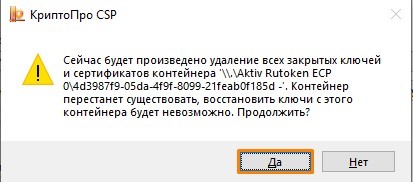 6. В открывшемся окне КриптоПро CSP выбрать «Да».
