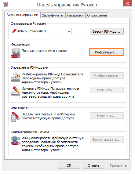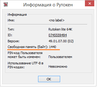 Проверить количество свободной памяти на Rutoken. Для этого следует: