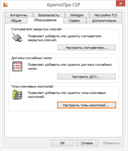 2. Перейти на вкладку «Оборудование» и нажать на кнопку «Настроить типы носителей».