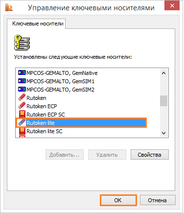 3. Выбрать из списка «Rutoken или Rutoken lite» и нажать на кнопку «Свойства».