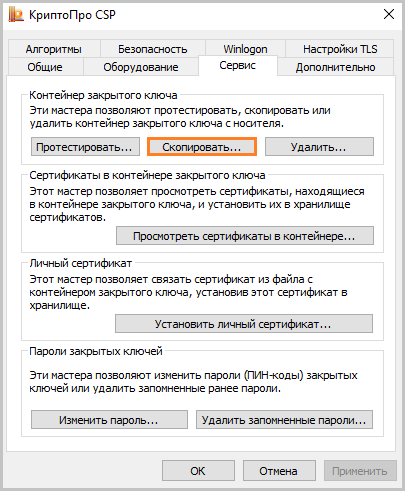 Выберите Пуск-Панель управления-КриптоПро CSP. Перейдите на вкладку «Сервис» и кликните по кнопке «Скопировать».