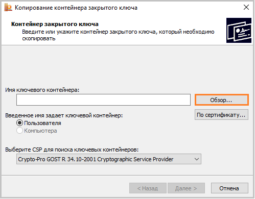 В окне «Копирование контейнера закрытого ключа» нажмите на кнопку «Обзор».