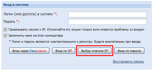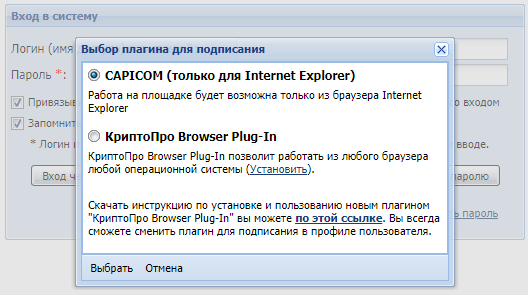 На некоторых электронный площадках на странице авторизации есть возможность выбора плагина для работы с подписью. К примеру, на странице авторизации ЭТП Росэлторг есть кнопка «Выбор плагина ЭП». Кликнув на нее, есть возможность выбрать плагин:
