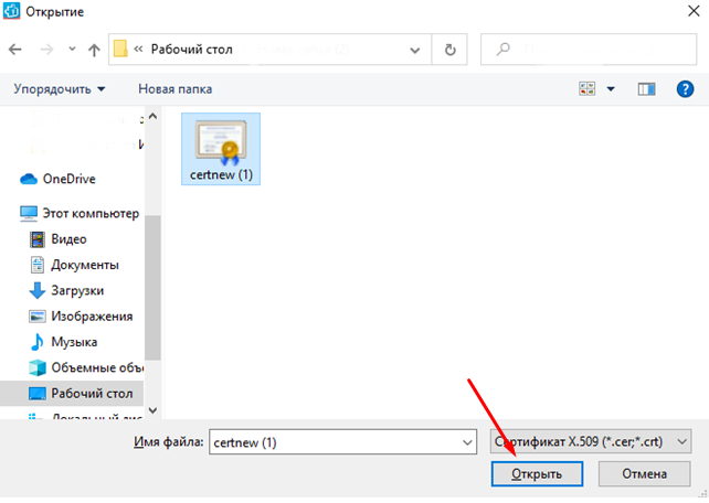 - Выберите сертификат, который ранее сохранили на рабочий стол, нажмите открыть.