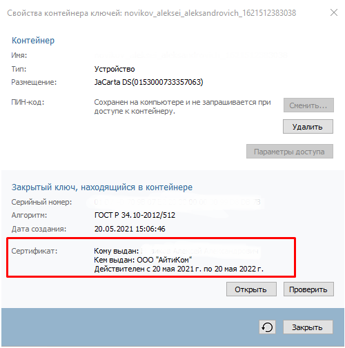 - В открывшемся окне, если в поле «Сертификат» указана данная информация, значит сертификат подписи установлен успешно.